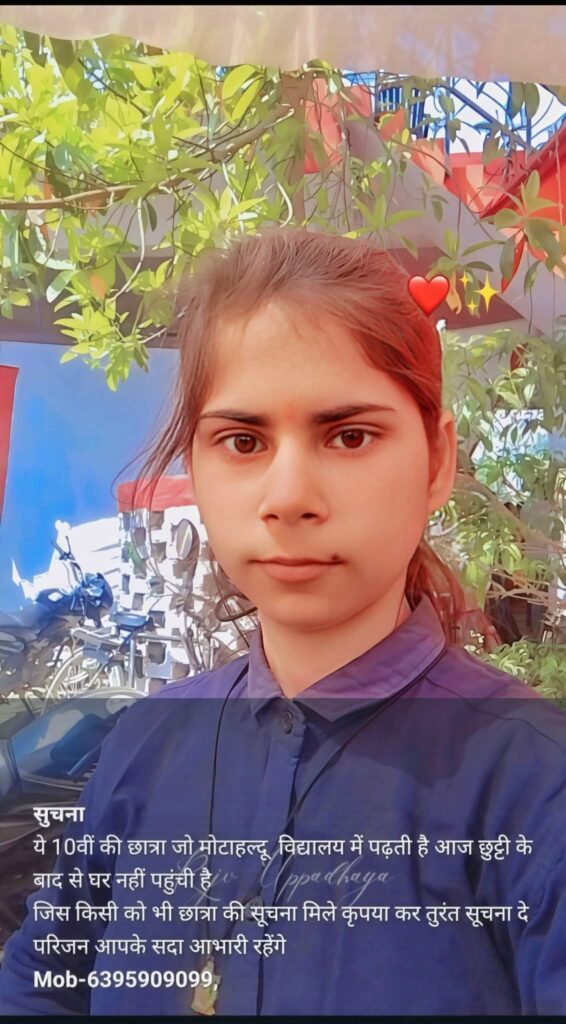मोटाहल्दू। लालकुआं कोतवाली क्षेत्र से एक दसवीं में पढ़ने वाली बालिका आज लापता हो गई है जिसकी स्कूल ड्रेस झाड़ियों से बरामद हुई है। इसके बाद पूरे क्षेत्र में कोहराम मचा हुआ है पुलिस जांच कर खोज में जुट गई है।