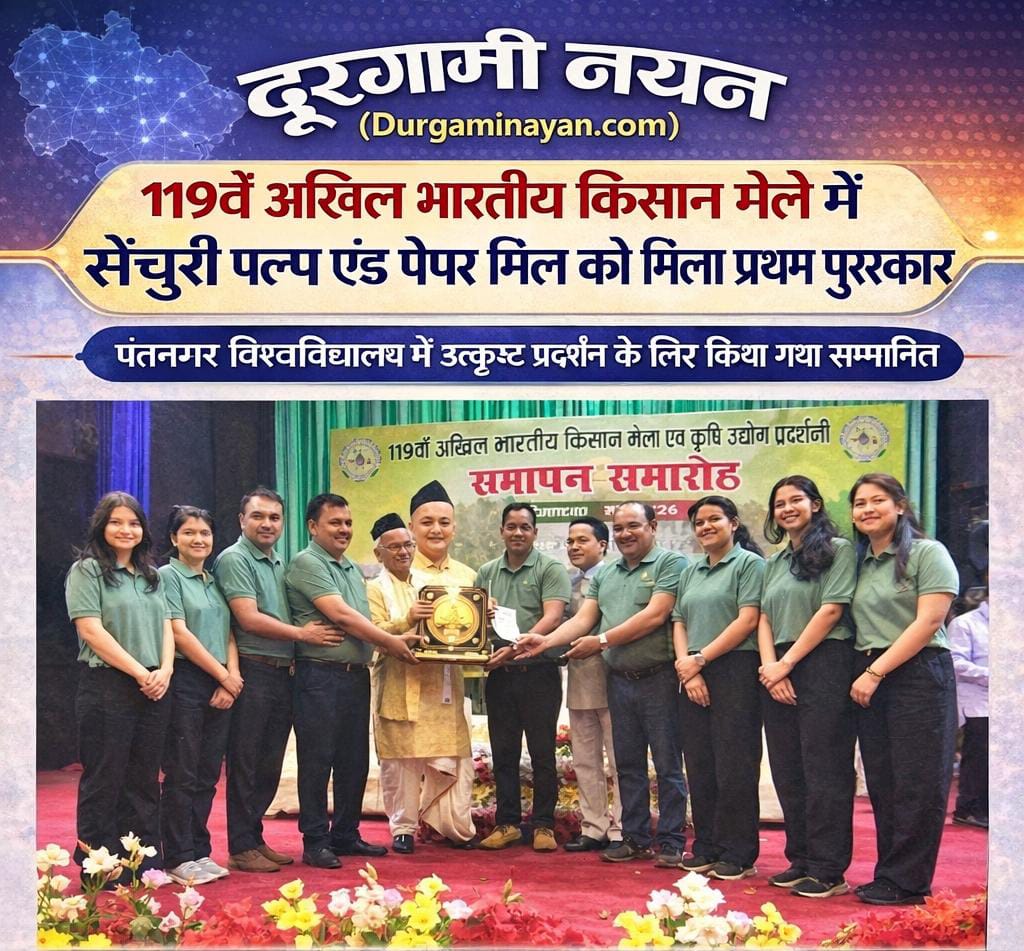 मिल प्रबंधन को पंतनगर विश्वविद्यालय में उत्कृष्ट प्रदर्शन के लिए किया गया सम्मानित । यहां पण्डित गोविन्द बल्लभ पंत कृषि एवं प्रौद्योगिकी विश्वविद्यालय, पंतनगर में आयोजित 119वें अखिल भारतीय किसान मेले के समापन समारोह में उत्कृष्ट प्रदर्शन के लिए सेंचुरी पल्प एंड पेपर मिल को प्रथम पुरस्कार से सम्मानित किया गया। इसके लिए मिल प्रबंधन ने आभार व्यक्त करते हुए कहा कि वह हरित क्रांति के लिए लगातार प्रयासरत हैं।