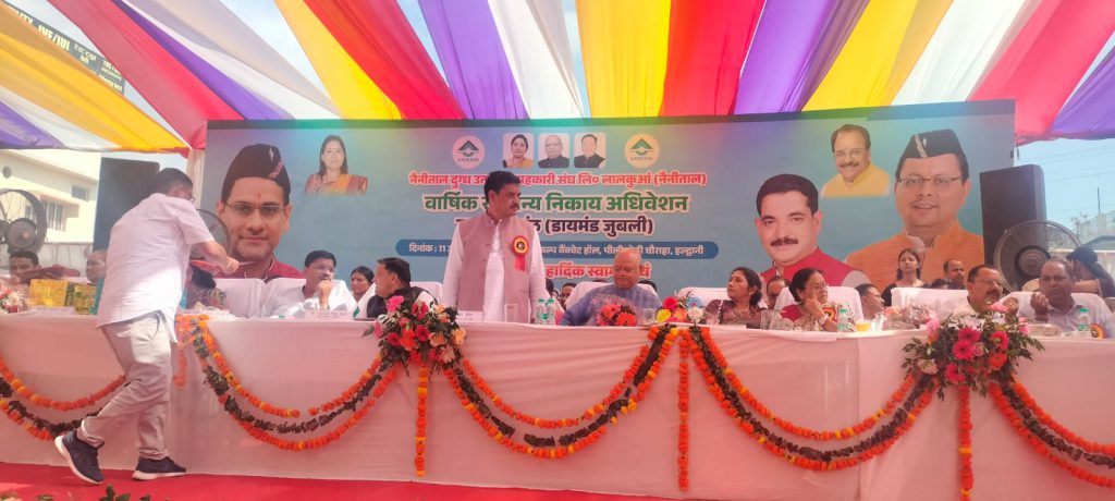 हल्द्वानी/लालकुआं। नैनीताल दुग्ध संघ लालकुआं का शनिवार को संकल्प बैंकट हाल में 75 वर्ष पूरे होने पर डायमंड जुबली कार्यक्रम आयोजित किया गया। इस अवसर पर वार्षिक अधिवेशन भी आयोजित किया गया जिसमें पी एम का धन धान्य योजना पर सीधा लाइव प्रसारण दुग्ध संघ अधिवेशन में आए लोगों की दिखाया गया।