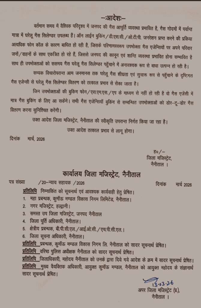 सभी गैस एजेंसियों को निर्देशित किया गया है कि वे बुकिंग से संबंधित उपभोक्ताओं को नियमानुसार घर-घर गैस सिलेंडर की आपूर्ति सुनिश्चित करें।जिला प्रशासन ने स्पष्ट किया है कि यह आदेश जिला मजिस्ट्रेट नैनीताल की स्वीकृति से जारी किया गया है तथा तत्काल प्रभाव से लागू होगा।