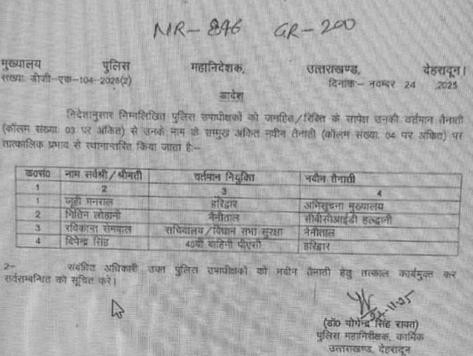 देहरादून। उत्तराखंड शासन ने चार सीओ इधर से उधर भेजे हैं जिनमें नितिन लोहनी सहित चार अधिकारी शामिल हैं। नितिन लोहनी ने हल्द्वानी ने अच्छा प्रदर्शन किया था।