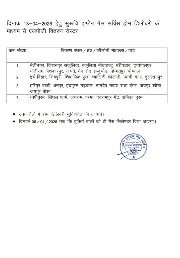 लालकुआं। यहां कोतवाली क्षेत्र के अन्तर्गत इन क्षेत्रों में होगा गैस सिलेंडरों का वितरण, प्रशासन ने जारी किए क्षेत्रों के नाम,आज कौन कौन से क्षेत्रों में होगा गैस सिलेंडरों का वितरण, प्रशासन ने जारी की लिस्ट।