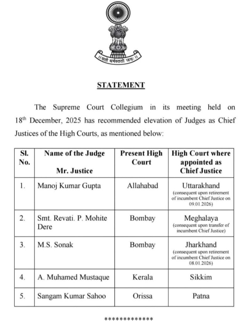 नैनीताल। उत्तराखंड हाईकोर्ट के नए चीफ जस्टिस मनोज कुमार गुप्ता होंगे। उत्तराखंड हाईकोर्ट के नए चीफ जस्टिस सुप्रीम कोर्ट के कॉलेजियम ने की जस्टिस गुप्ता की नियुक्ति की संस्तुति ।