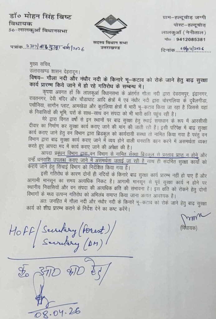 लालकुआं/देहरादून। स्थानीय विधायक डॉक्टर मोहन बिष्ट ने गौला नदी और नंधोर नदी से हो रहे भू कटाव को रोकने के लिए तत्काल तटबंध बनाए जाने की मांग की है। उन्होंने ज्ञापन दिया है जिसमें सभी उन जगहों को चिन्हित किया गया है जहां भू कटाव हो रहा है तथा आने वाले मानसून से खतरा बना हुआ है।