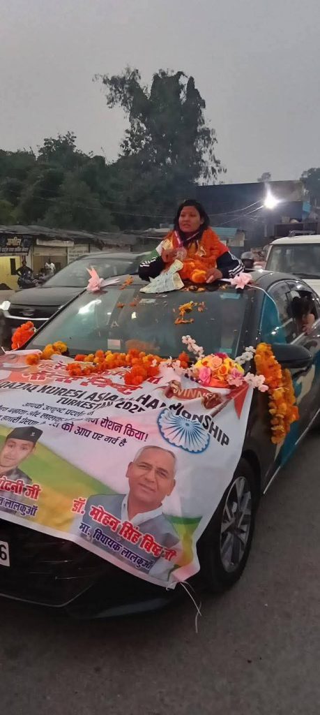 बिंदुखत्ता। भारतीय जनता पार्टी के बूथ अध्यक्ष नरेंद्र सिंह बिष्ट की सुपुत्री मोनू_बिष्ट ने गरीब परिवार से चलकर संघर्ष किया और तुर्किस्तान कज़ाख़स्तान में आयोजित #Qazaq_Kuresi_Asian_Championships_2025 में 70 किलोग्राम महिला कैटेगरी में #कांस्य_पदक जीतकर बिंदुखत्ता क्षेत्र सहित पूरे नैनीताल जिले,उत्तराखंड और भारत का नाम रोशन किया है।
