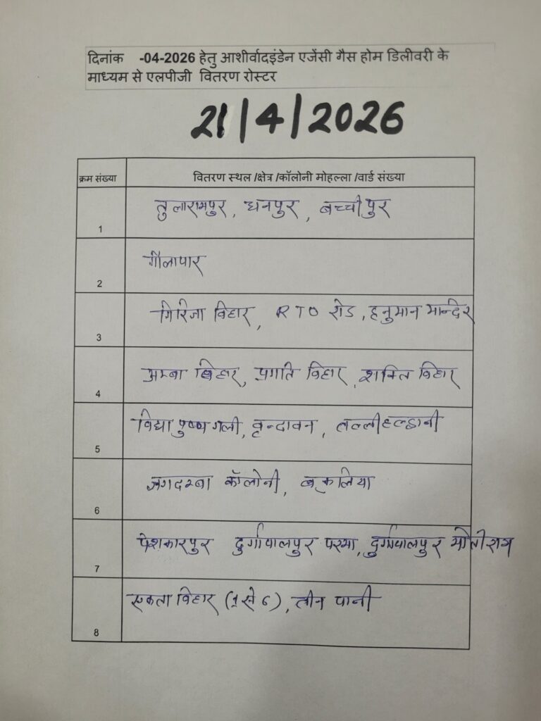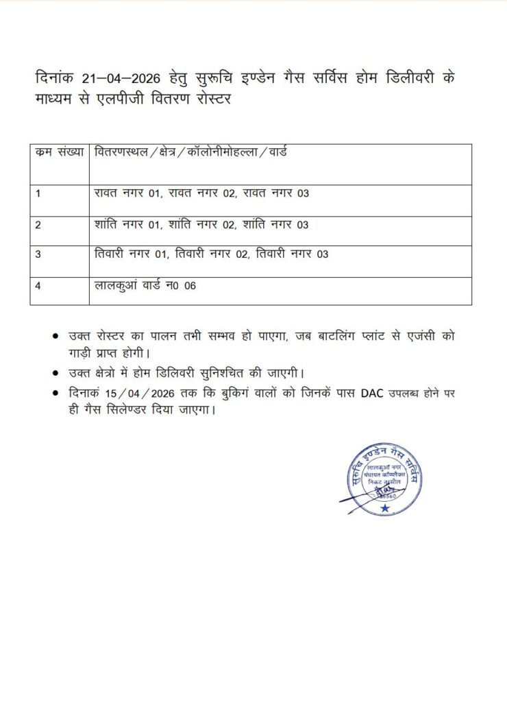 लालकुआं। यहां कोतवाली क्षेत्र के अन्तर्गत मंगलवार को विभिन्न स्थानों पर वितरित किए जाएगें रसोई गैस सिलेंडर। जिला प्रशासन ने जारी किया रोस्टर, इन क्षेत्रों में होगा गैस सिलेंडरों का वितरण,15 अप्रैल तक बुकिंग वालों को ही मिलेगा गैस सिलेंडर।