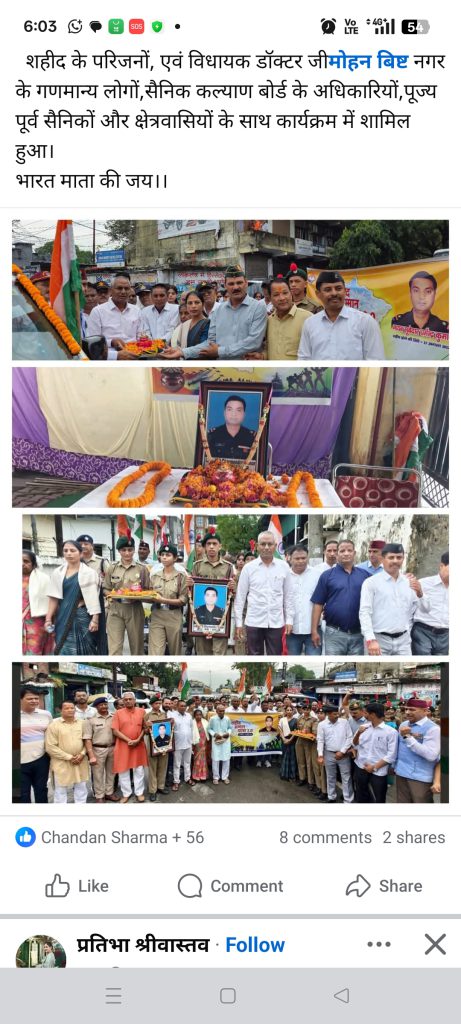इस यात्रा में शहीद के परिजनों के अलावा पूर्व सैनिकों, विधायक डॉक्टर मोहन बिष्ट नगर के गणमान्य लोगों, सैनिक कल्याण बोर्ड के अधिकारियों, पूर्व सैनिकों और क्षेत्रवासियों ने प्रतिभाग किया ।