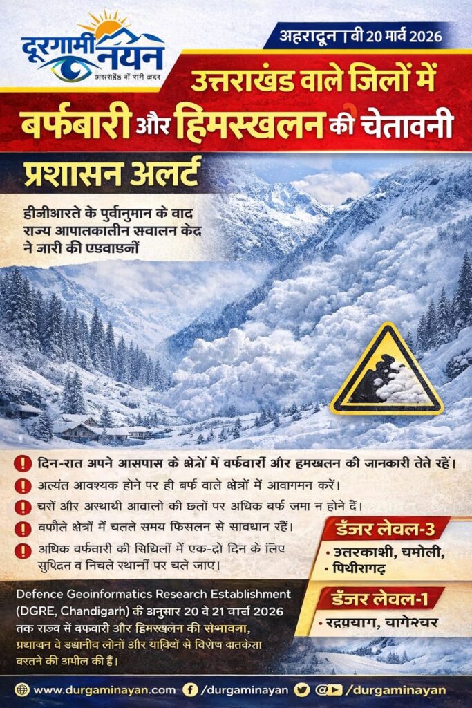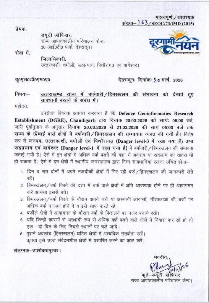 चंडीगढ़ स्थित Defence Geoinformatics Research Establishment (DGRE) द्वारा 20 मार्च 2026 को शाम 5 बजे जारी पूर्वानुमान के अनुसार 20 मार्च से 21 मार्च 2026 तक राज्य के कई पर्वतीय जिलों में बर्फबारी और हिमस्खलन का खतरा बना हुआ है।