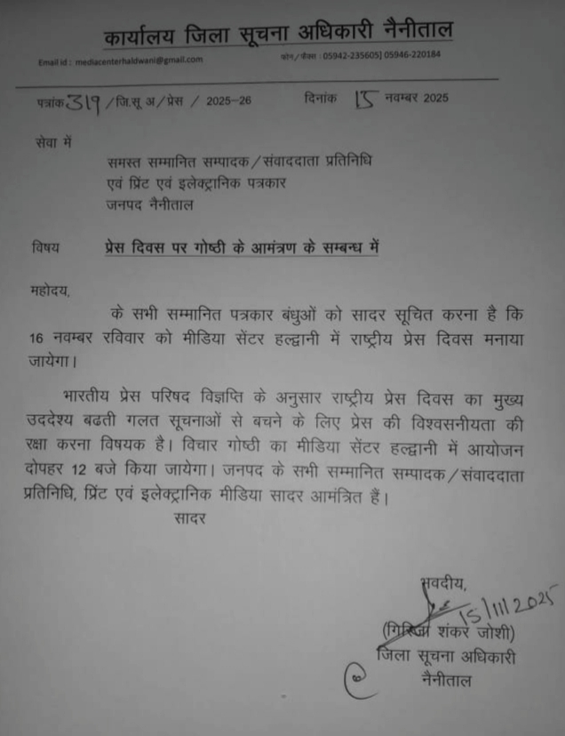 प्रेस दिवस पर जनपद के सभी पत्रकारों को हार्दिक शुभकामनाएं देते हुए जिला सूचना अधिकारी ने कहा है कि आज आयोजित गोष्ठी में सभी प्रिंट मीडिया और इलेक्ट्रॉनिक मीडिया के संपादक और संवाददाता आमंत्रित हैं।