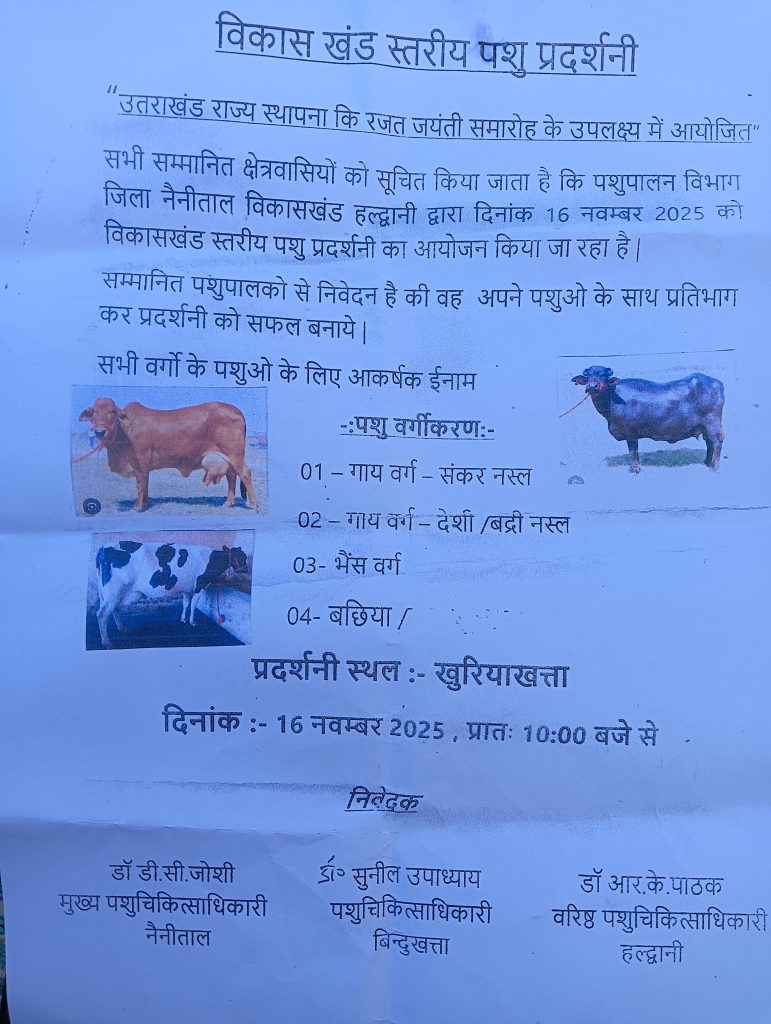 बिंदुखत्ता। उत्तराखंड राज्य स्थापना रजत जयंती समारोह के उपलक्ष्य में विकास खंड स्तरीय पशु प्रदर्शनी का आयोजन किया जा रहा है।